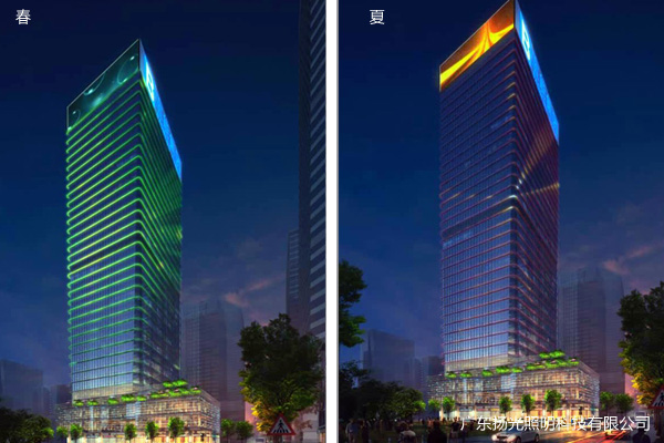 根據對建筑主體的解析,頂部在西北面設置LED顯示屏,東南面設置企業LOGO來增強建筑的標識度,立面采用燈管色勒,有效的表現出建筑龍骨結構的層次感,通過線條變化體現出城市高效發展的速度。
