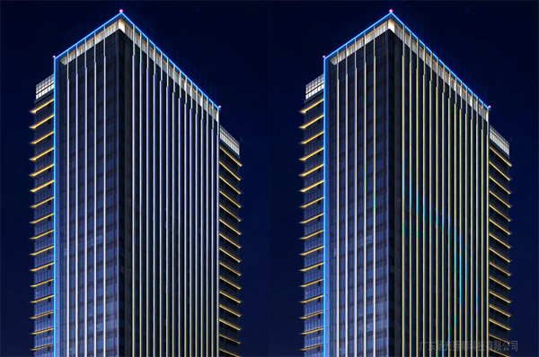 頂部半透明玻璃遮陽板后面投射燈光,營造發光效果;利用豎向鋁板線條鋪設燈光,燈光可電腦操控,可預設多種圖案;裙樓在樓板之間加燈光,要求發光亮度高。