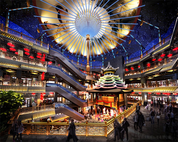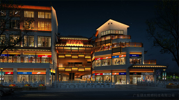 設(shè)計(jì)詳解之一—戲樓門頭隱藏布燈,強(qiáng)化標(biāo)識,突出門頭節(jié)點(diǎn)的重要地位,同時(shí)又簡潔大氣,盡顯中式特色,突出商業(yè)氣氛。