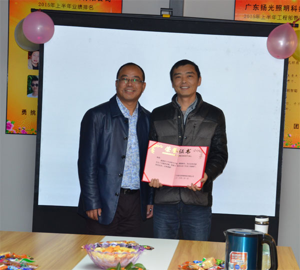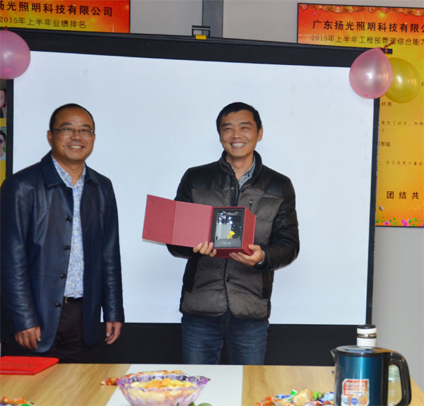 揚(yáng)光照明每年都要為跨進(jìn)10年工齡的老員工舉行表彰儀式,并授予榮譽(yù)獎?wù)隆D憧矗衲昃陀幸晃唬褪俏覀児镜墓こ滩靠偙O(jiān)——郭總。