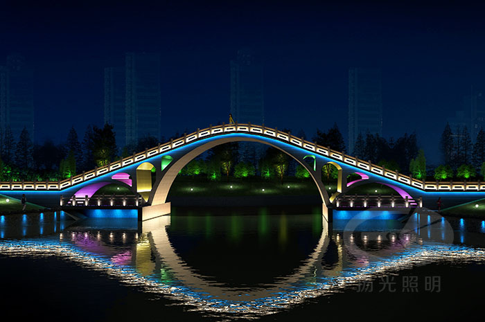 橋底面也要適度地設置照明,以顯示橋的立體感。底面照明時,應使其亮度與橋側面亮度形成適度差別,或在色調上形成一定的變化,以求效果的生動。同時還要考慮橋體照明與周邊園林、