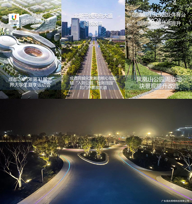 北星大道是成都向北聯(lián)系德陽(yáng)的主軸,也是2021世界大學(xué)生運(yùn)動(dòng)會(huì)的重要賽區(qū)所在地。而整個(gè)片區(qū)夜晚環(huán)境不足以表達(dá)區(qū)域特色,因此對(duì)北星大道兩側(cè),鳳凰山露天音樂公園及國(guó)際足球中心周邊場(chǎng)景進(jìn)行整治,既是大運(yùn)會(huì)期間的風(fēng)貌展示,也是城市發(fā)展的重要需要。